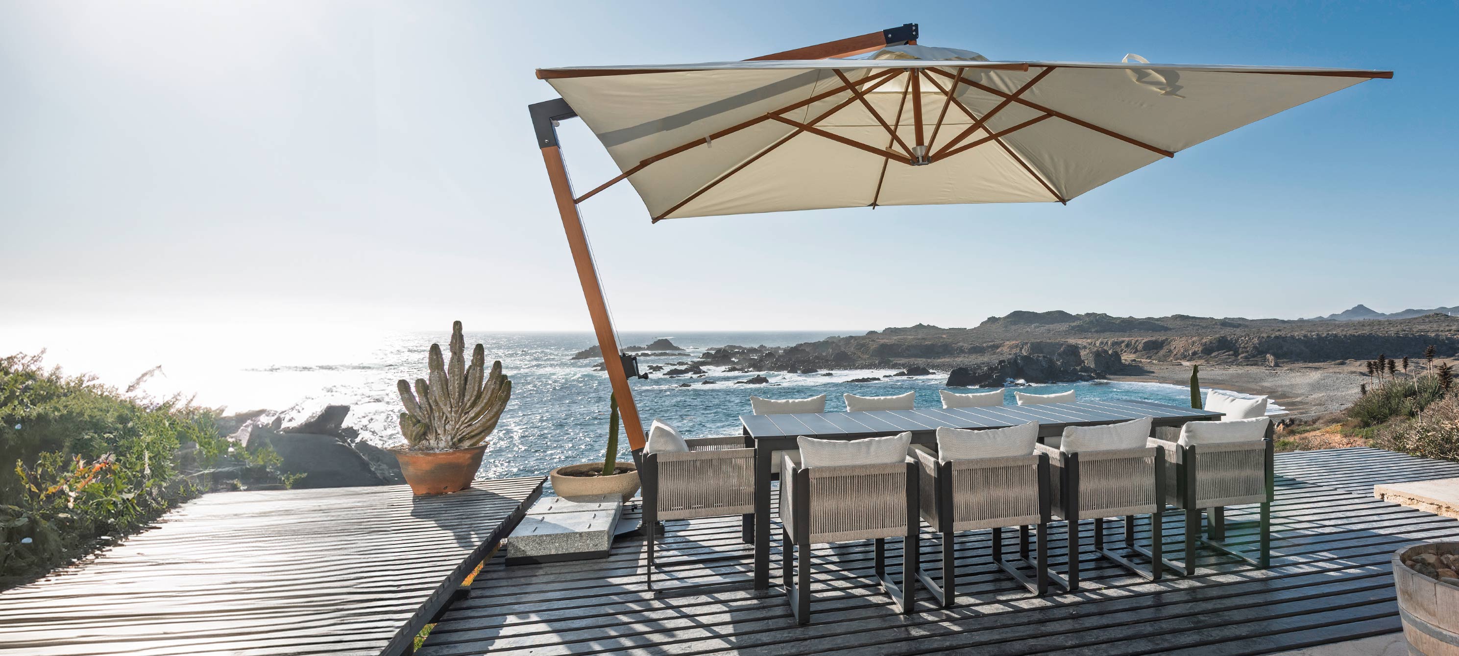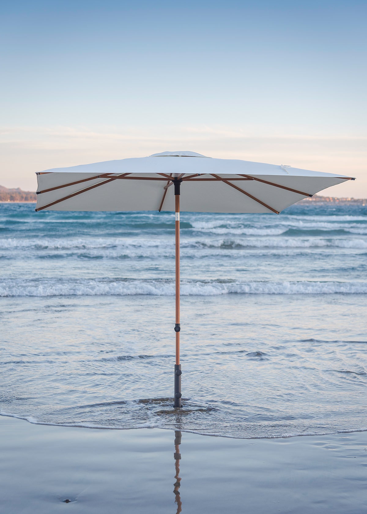 El quitasol cuenta con una estructura de aluminio 5001 con recubrimiento de pintura en polvo color antracita, ideal para ambientes salinos.