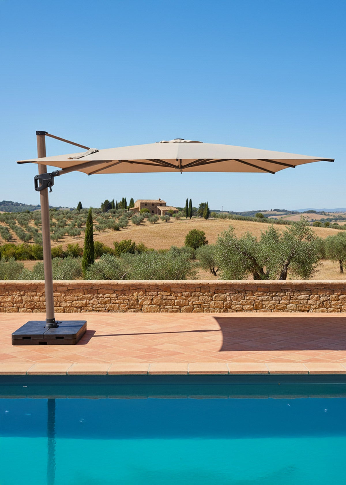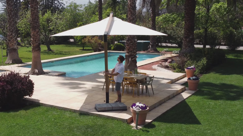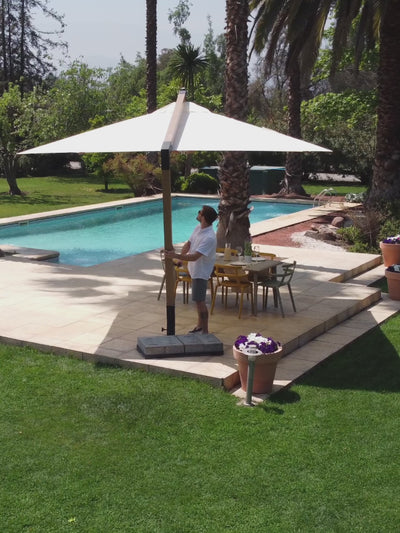 Ajustar la inclinación de la lona o girarla 360° alrededor del mástil. Seguir el sol y mover la sombra según necesidad. Gracias a la base giratoria y a la manivela ergonómica, toda la familia puede ajustar la sombrilla con facilidad.
