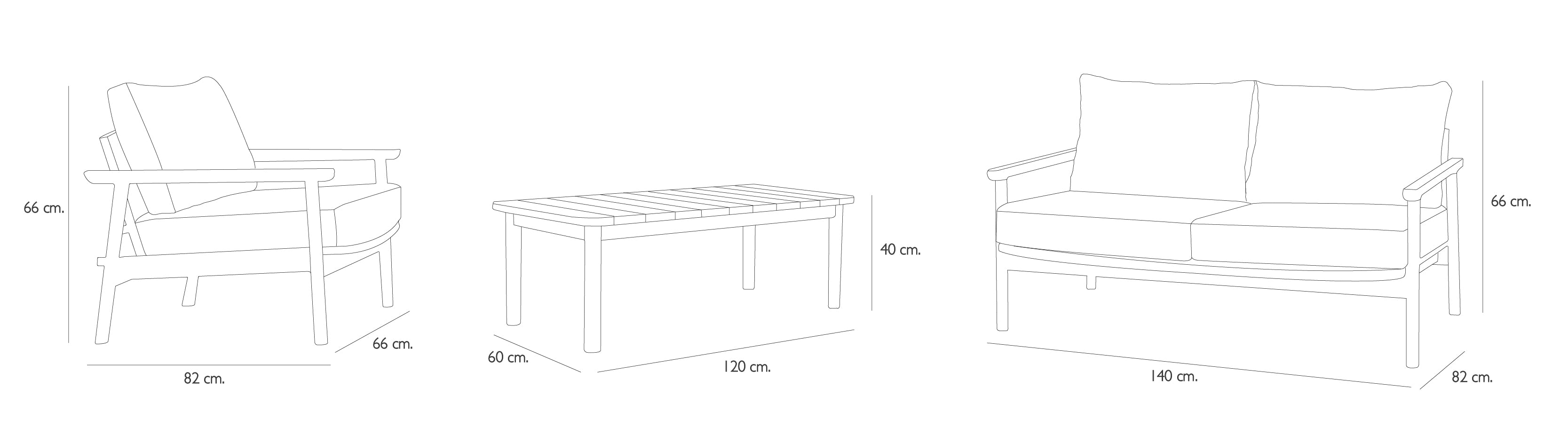 Sofá 2 cuerpos: 141 x 83 x 67 cms. Sofá 1 cuerpo: 75 x 83 x 67 cms. Mesa de centro: 121 x 93 x 20 cms. |