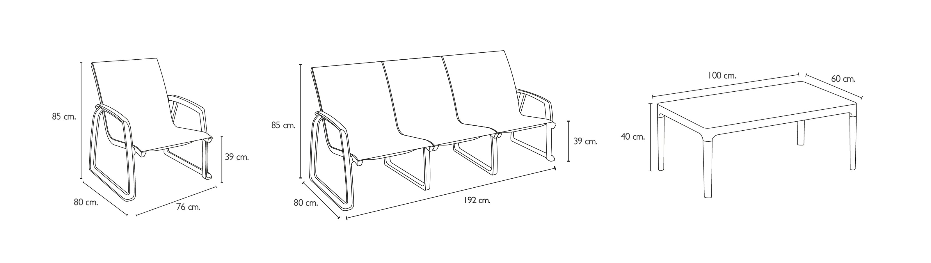 Medida sofá: Alto 85 cm - Profundidad 80 cm. - Ancho 192 cm. Medida sillón: Alto 85 cm - Profundidad 80 cm. - Ancho 76 cm. Medida mesa: Alto 40 cm. - Largo 100 cm. - Ancho 60 cm. |