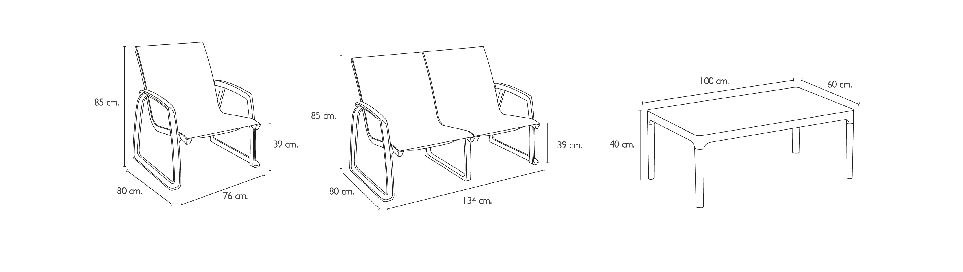 Medida sofá: Alto 85 cm - Profundidad 80 cm. - Ancho 134 cm. Medida sillón: Alto 85 cm - Profundidad 80 cm. - Ancho 76 cm. Medida mesa: Alto 40 cm. - Largo 100 cm. - Ancho 60 cm. |
